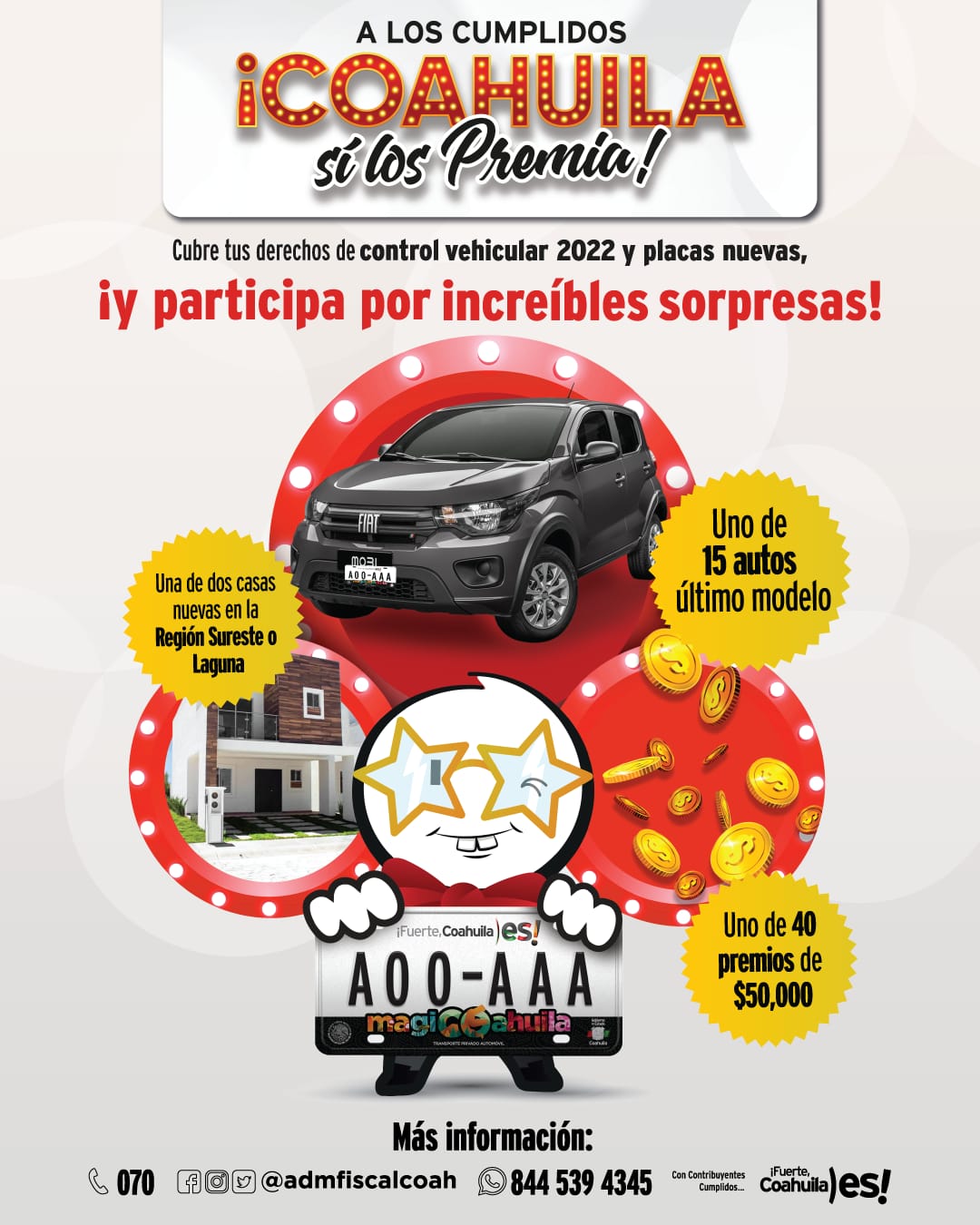 “Al pagar tus derechos de control vehicular y placas 2022 antes del 31 de marzo del presente año participas automáticamente para ganar increíbles sorpresas, como una de dos casas nuevas en la Región Sureste o Laguna, uno de 15 autos último modelo o uno de 40 premios de $50,000 pesos”, explicó Díaz González.