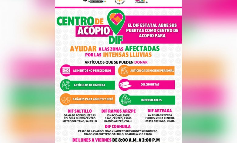 El Centro de Acopio DIF Coahuila se ubica en Paseo de las Arboledas y Jaime Torres Bodet, sin número, Fraccionamiento Chapultepec, en Saltillo, y permanecerá abierto de 8:00 a.m. a 15:00 p.m. para recibir:
