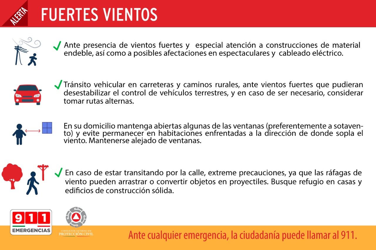 · Extremar precauciones ante presencia de vientos fuertes y especial atención a construcciones de material endeble, así como a posibles afectaciones en espectaculares y cableado eléctrico.
