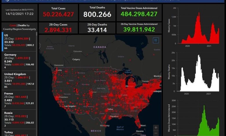 Más de 800 mil personas en Estados Unidos han muerto por la pandemia de Covid-19, de acuerdo con el recuento de la Universidad Johns Hopkins, mientras el país se prepara para un posible aumento de los contagios debido al clima más frío y la variante Ómicron del virus.