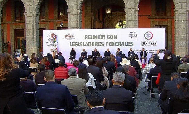 El presidente Andrés Manuel López Obrador se reúne con legisladores federales en Palacio Nacional para agradecerles aprobación del Presupuesto 2022, que según el mandatario, alcanzará para beneficiar a 25 millones de familias, obras de infraestructura y fortalecer el mercado interno.