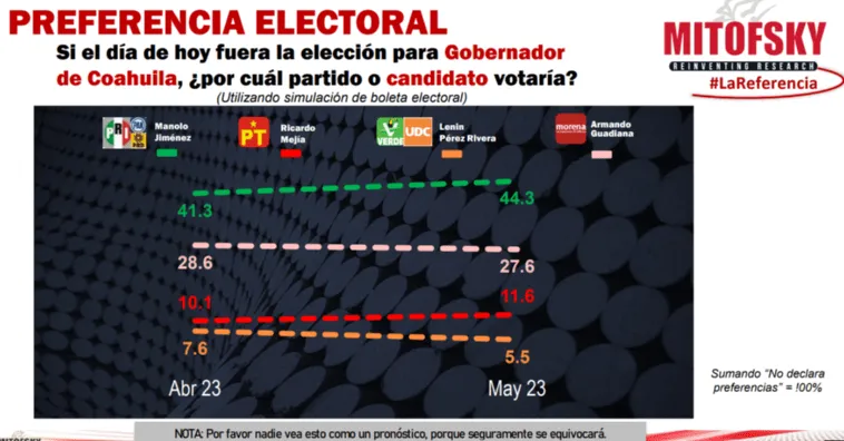 Las tendencias en el proceso electoral de Coahuila, que se realizará el próximo 4 de junio, han mostrado una creciente ventaja para la alianza PRI-PAN-PRD entre los partidos contendientes y para su candidato, Manolo Jiménez Salinas, entre los aspirantes a la gubernatura de la entidad.