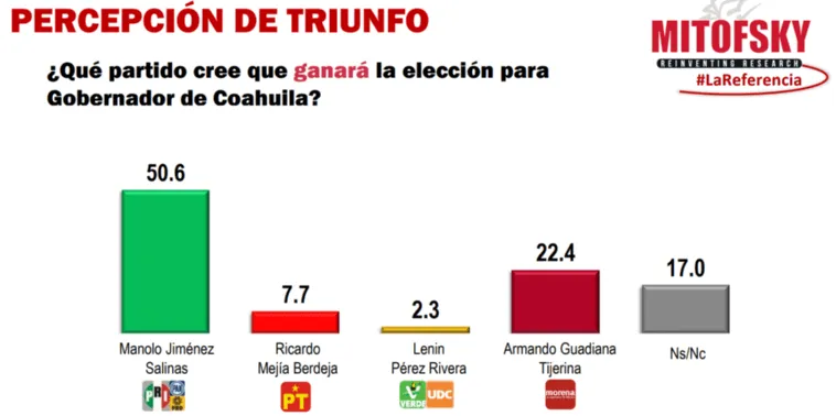 Asimismo, entre los candidatos y los partidos, la expectativa de triunfo para el abanderado de la alianza PRI-PAN-PRD se ha incrementado a un ritmo mayor que sus adversarios, y la relación entre Jiménez y el partido que lo respalda con su más cercano seguidor es de dos a uno, de acuerdo con la población consultada.