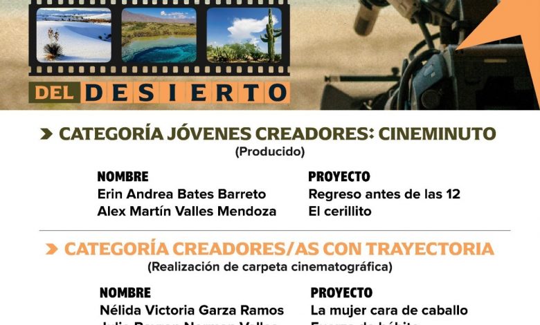 Mientras que en la categoría Creadores/as con Trayectoria (Realización de carpeta cinematográfica), con un estímulo de 160 mil pesos cada uno resultaron ganadores: Nélida Victoria Garza Ramos con “La Mujer Cara De Caballo”, y Julio Bayron Norman Valles, con “Fuerza De Hábito”.
