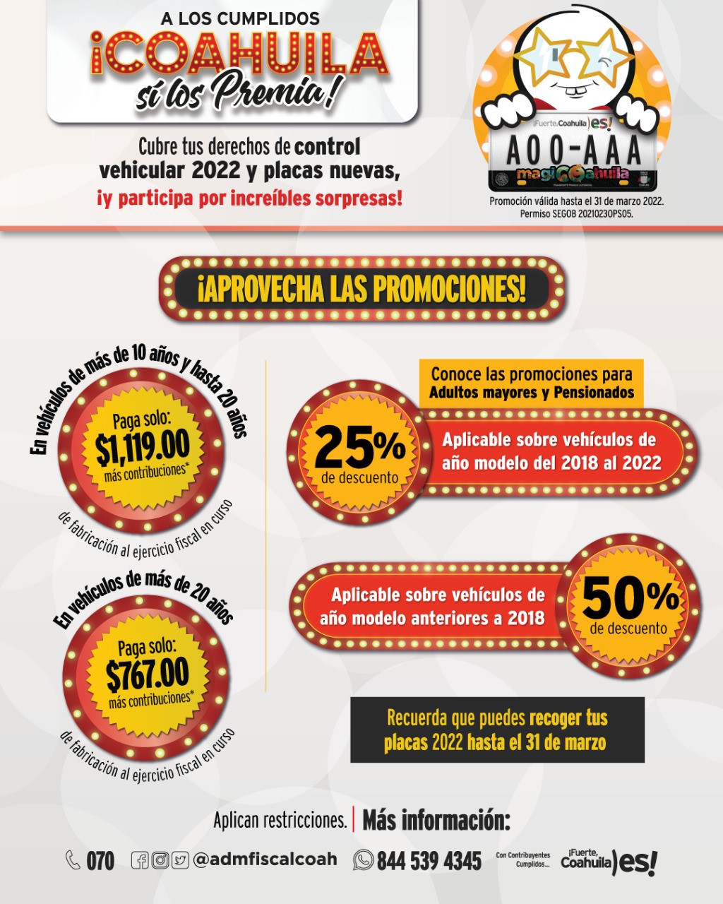 El Gobierno del Estado de Coahuila tiene para ti grandes promociones, cubre tus derechos de control vehicular y placas 2022 antes del 31 de marzo del año en curso y participa por increíbles sorpresas.