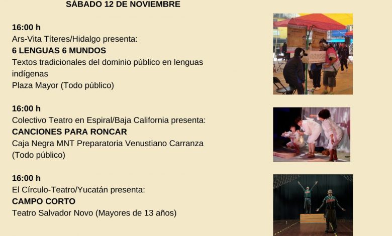 La Secretaria de Cultura de Coahuila, Ana Sofía García Camil, comentó que las actividades darán inicio en punto de las 16:00 horas con la obra “Canciones para roncar”, de Michelle Guerra Adame, por el Colectivo Teatral en Espiral de Baja California.