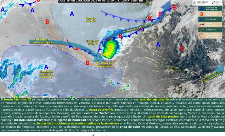 La Secretaría de Gobierno, a través de la Subsecretaría de Protección Civil del Estado, informa que la masa de aire frío asociada al frente frío número 42 originará un refrescamiento de las temperaturas sobre el norte del país. Se esperan lluvias e intervalos de chubascos con descargas eléctricas en las regiones Norte, Carbonífera, Centro-Desierto y Sureste, así como rachas de viento de 40 a 60 km/h.