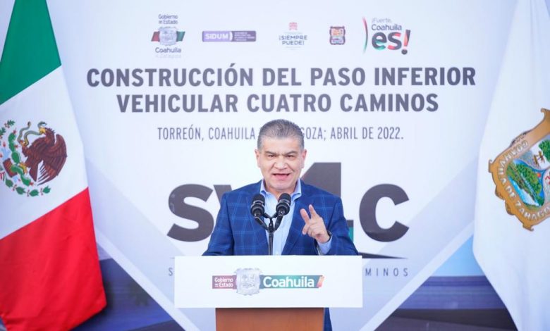 Con el inicio de la construcción del “Sistema Vial Cuatro Caminos”, que se desarrollará en el crucero del mismo nombre, uno de los sectores con mayor dinamismo económico al norte de la ciudad, el gobernador Miguel Ángel Riquelme Solís arrancó hoy lunes en Torreón el plan de obras proyectado para 2022, en el que se invertirán en forma global alrededor de 800 millones de pesos de recursos procedentes del Impuesto Sobre Nóminas (ISN).