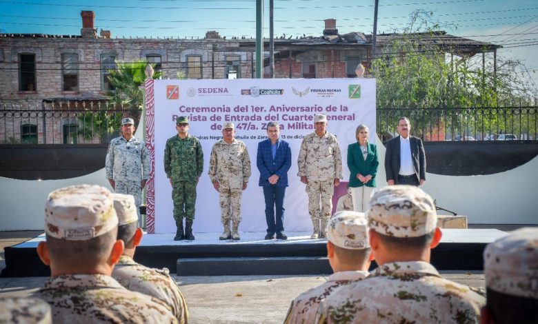 El Gobernador del Estado Miguel Ángel Riquelme Solís, el Secretario de Gobierno Fernando de las Fuentes y la Alcaldesa Norma Treviño Galindo, asistieron al festejo del primer aniversario de la 47 zona militar de Piedras Negras para acompañar al General José Fausto Torres Sánchez, comandante de este destacamento.