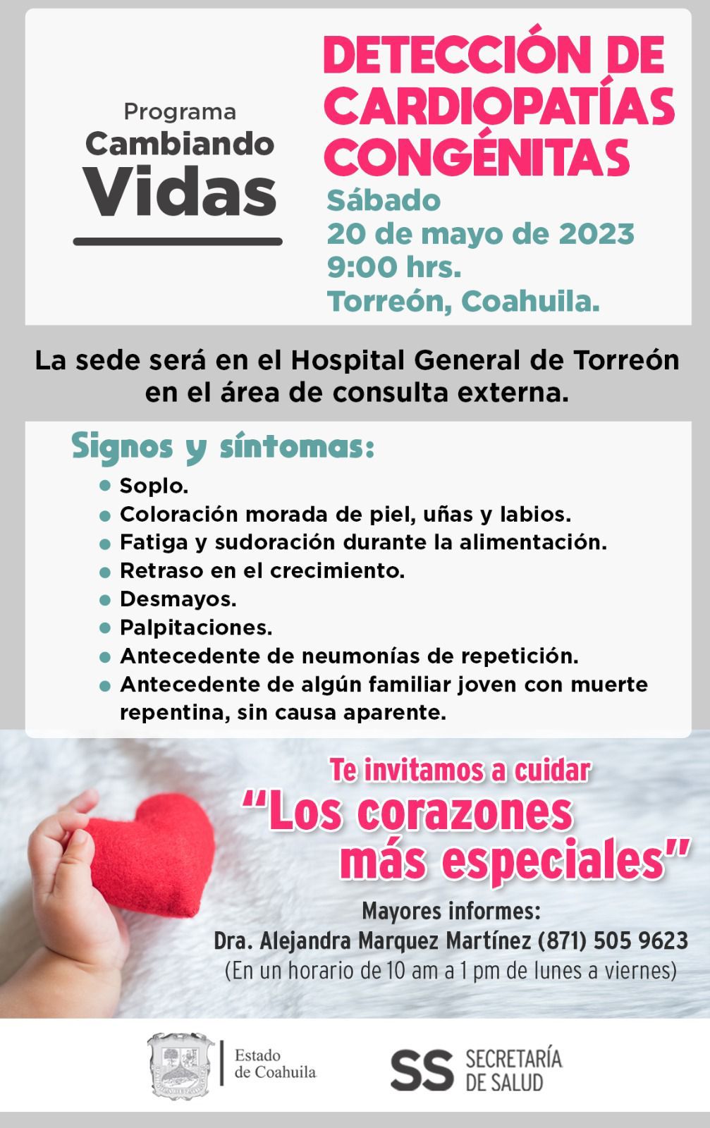 El Gobierno del Estado, a través de su Secretaría de Salud, anunció la Jornada de Detección de Cardiopatías Congénitas en las instalaciones del Hospital General de Piedras Negras el próximo viernes 19 de mayo, y el sábado 20 de mayo en el Hospital General de Torreón.