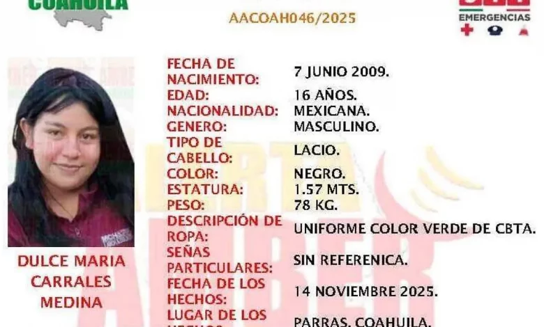 Redacción | Parras de la Fuente, Coah.- La Fiscalía de Personas Desaparecidas de Coahuila emitió un llamado urgente para dar con el paradero de Dulce María Carrales Medina, una joven de 16 años reportada como desaparecida en el municipio de Parras de la Fuente.