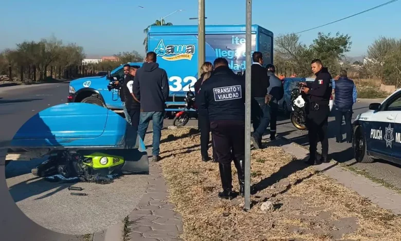 Un motociclista terminó gravemente lesionado, luego de que fue embestido por un camión repartidor de agua y su moto quedó bajo la pesada unidad, por lo que tuvo que ser trasladado de urgencia a un hospital en Torreón.