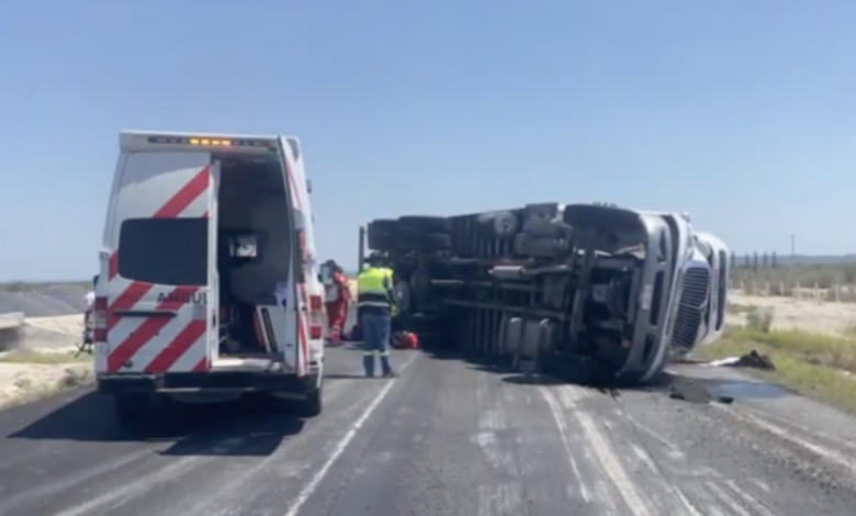 El incidente ocurrió poco antes de las 11:30 horas, cuando el conductor de la unidad pesada, identificado como Rubén Sauceda García, de 42 años, perdió el control del vehículo y terminó volcando sobre la cinta asfáltica.