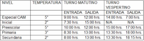 Para proteger la salud de los niños, niñas, adolescentes y docentes de nivel básico del Estado de Coahuila, se informa que a partir de la fecha y hasta nuevo aviso se ajustan los horarios de entrada y salida en las escuelas públicas en atención presencial de educación básica, como a continuación se describen: