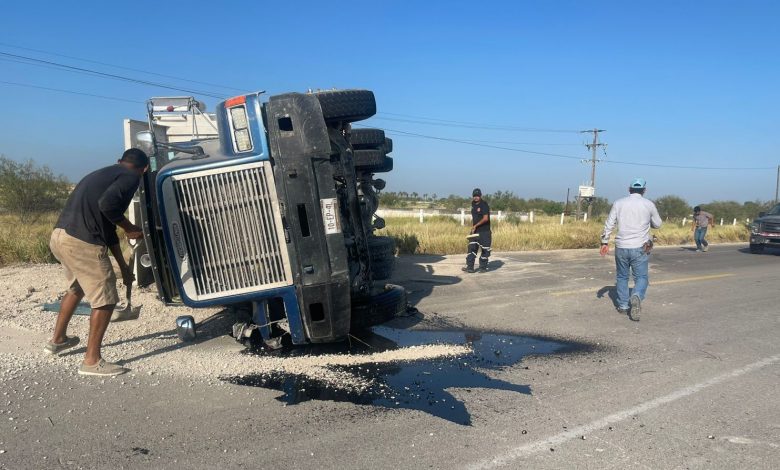 Redacción | Piedras Negras, Coah.– La circulación sobre la carretera Ribereña número 2 fue interrumpida temporalmente la mañana de este martes, luego de que un tractocamión cargado con arena volcara a escasos metros del aeropuerto local.