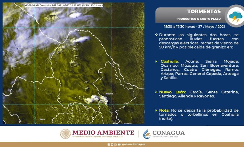 Para las próximas horas se prevén condiciones para lluvias fuertes, descargas eléctricas y granizo en áreas de Coahuila, así como viento con rachas de 70 a 80 km/h y posible formación de tornados o torbellinos en el norte del estado.