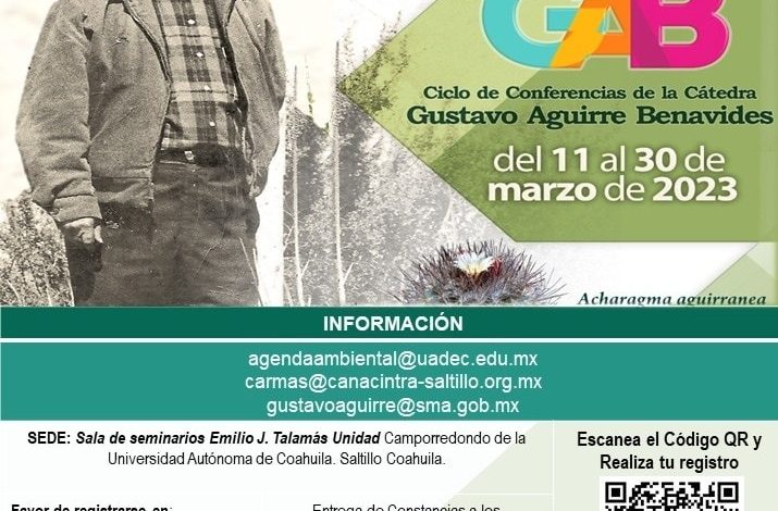 La Secretaría de Medio Ambiente del Estado (SMA), la Universidad Autónoma de Coahuila y CANACINTRA Sureste, realizarán la XI Edición de la Cátedra “Gustavo Aguirre Benavides 2023”, entre el 11 y el 30 de marzo, que se desarrollará con el tema “Biodiversidad”.