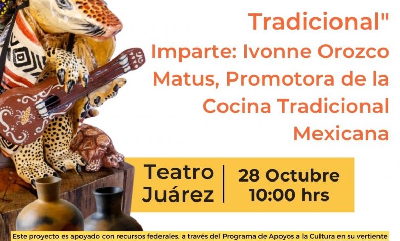 + Viernes 28 de octubre, 10:00 horas, conferencia “Cocina Tradicional”, Ivonne Orozco Matus, promotora de la Cocina Tradicional Mexicana, en el Teatro Juárez.