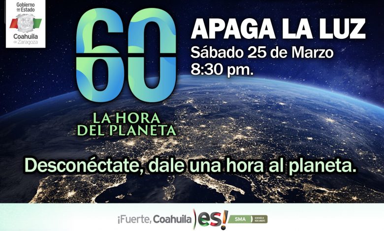Este sábado, a partir de las 20:30 horas, Coahuila se sumará a la Hora del Planeta, con el apagado de luces en edificios del Gobierno del Estado, parques recreativos e instituciones de Educación Superior de Saltillo.
