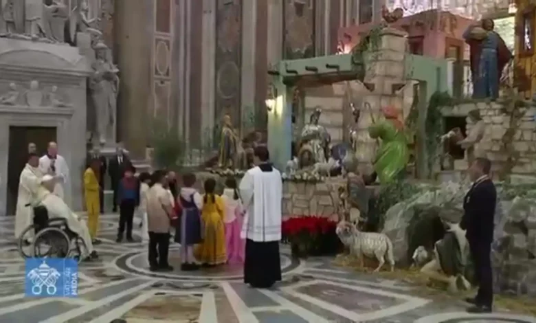 Después de la Homilía, el Papa Francisco se trasladó hasta el Nacimiento, en donde fue colocada la figura del Niño Dios en el Pesebre de la Basílica Vaticana, en donde su Santidad realizó una oración junto a niñas y niños representantes de diversos países, quienes colocaron además una ofrenda floral en el Nacimiento.