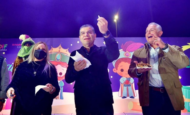 El gobernador Miguel Ángel Riquelme Solís y Marcela Gorgón, Presidenta Honoraria del DIF Coahuila, compartieron con las familias laguneras la tradicional Rosca de Reyes en la explanada de la Plaza Mayor, en donde en todo momento se cumplió con las medidas sanitarias, y desde donde deseó a todas las familias de la entidad un próspero 2022.