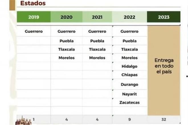 Según información presentada en conferencia, en 2019 sólo Guerrero recibía apoyo en fertilizantes; en 2020 sumaron a Puebla, Tlaxcala y Morelos; y en 2022, a Hidalgo, Chiapas, Durango, Nayarit y Zacatecas.
