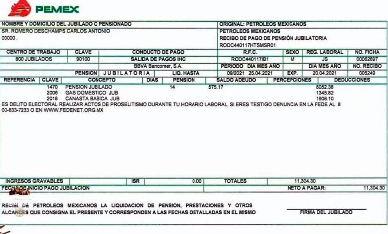El recibo del 25 de abril, de Romero Deschamps, exhibido en Palacio Nacional, refieres que recibirá unos 22 mil 600 pesos mensuales.