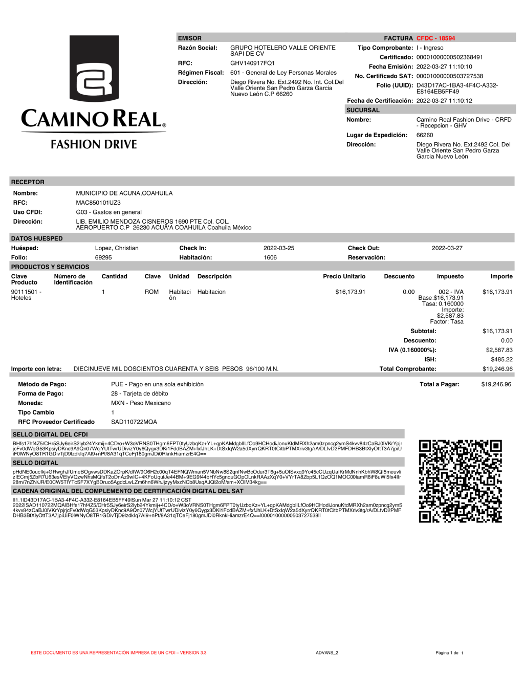 La factura, con registro auténtico del SAT y vigente hasta esta fecha, fue presentada hoy ante el Congreso local por la diputada panista Mayra Valdés González, quien denunció el caso ante los indicios de que el Secretario Particular del alcalde, Christian Alberto López Rodríguez, habría acudido al señalado concierto y solicitado que el costo del hospedaje se facturara al Municipio.