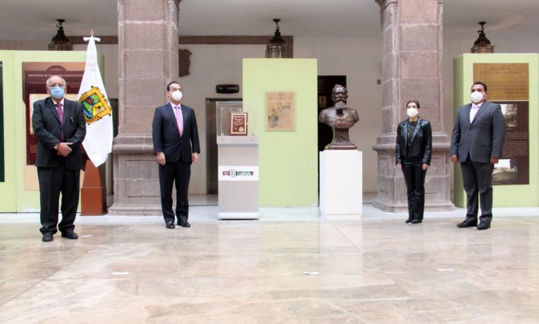 Junto a la titular de la Secretaría de Cultura del Estado, Ana Sofía García Camil, montó Guardia de Honor ante el busto de don Venustiano Carranza, colocado en el patio central de Palacio de Gobierno.