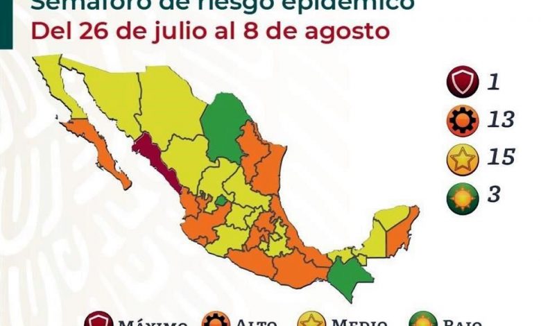Entre los retrocesos informados en el semáforo, que regirá del 26 de julio al 8 de agosto, se menciona al del Estado de México, que por segunda semana consecutiva retrocede en cuanto al color de riesgo.