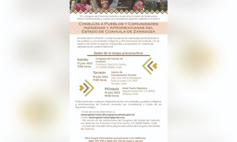 El Congreso del Estado de Coahuila, a través de la Comisión de Gobernación, Puntos Constitucionales y Justicia, llevará a cabo este viernes 15 de julio en el municipio de Múzquiz, un proceso previo encaminado a la consulta a comunidades y pueblos indígenas y afromexicanas con el objetivo de recibir la opinión, inquietudes y propuestas en materia de representación político-electoral y así integrarlas al trabajo legislativo local, por lo que se extiende una invitación a todas las personas asentadas pertenecientes a estos pueblos y comunidades de Coahuila, a que participen en esta reunión que forma parte de las que se realizarán en otras regiones del estado.