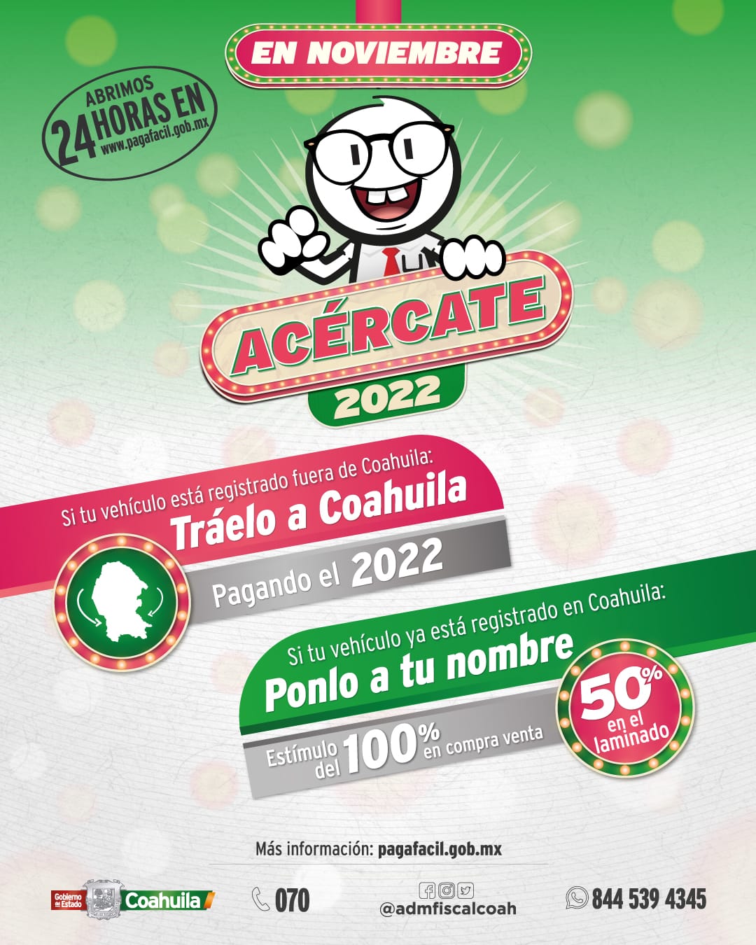 Recibe asistencia fiscal personalizada a través de la página de Administración Fiscal del Estado (@admfiscalcoah) en Facebook, enviando un WhatsApp al 844 539 4345 o llamando al Centro de Atención Telefónica y Trámites, 070, donde un asesor fiscal resolverá todas tus dudas.