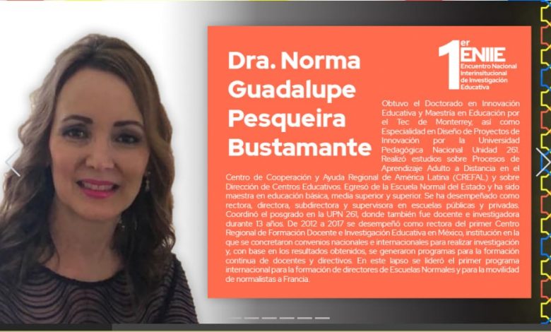 En esta ocasión intervino como ponente, Normal Guadalupe Pesqueira Bustamante, egresada de la Normal del Estado, quien además es Doctora en Innovación Educativa y Maestra en Educación por el Tecnológico de Monterrey, quien tiene la especialidad en Diseño de Proyectos de Innovación por la UPN, entre otras acreditaciones, además de ser integrante del Comité Técnico en Comisión Nacional para la Mejora Continua de la Educación.