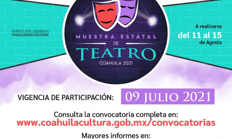 La dependencia estatal detalló que los interesados deberán solicitar la ficha de inscripción al correo artesescenicas.coahuila@gmail.com. Ahí mismo se pueden solicitar informes de la presente convocatoria o en el link: https://coahuilacultura.gob.mx/convocatorias/convocatoria-muestra-estatal-de-teatro/