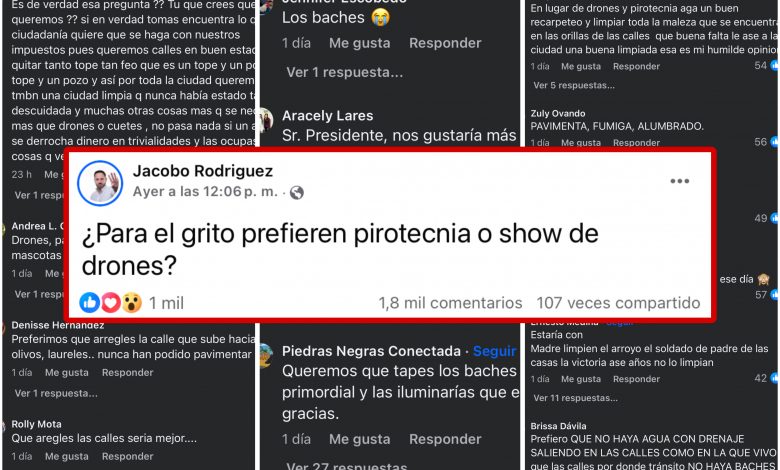 Indignación y burla generó entre los ciudadanos de Piedras Negras la publicación del alcalde en Facebook donde, como si se tratara de un concurso escolar, preguntó si preferían drones o pirotecnia para celebrar el Grito de Independencia.