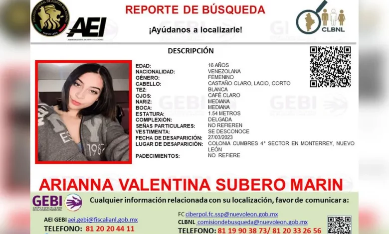 La Fiscalía de Justicia de Nuevo León y la Agencia Estatal de Investigaciones emitieron un reporte de búsqueda para localizar a una menor de edad de nacionalidad venezolana identificada como Arianna Valentina Subero Marín.