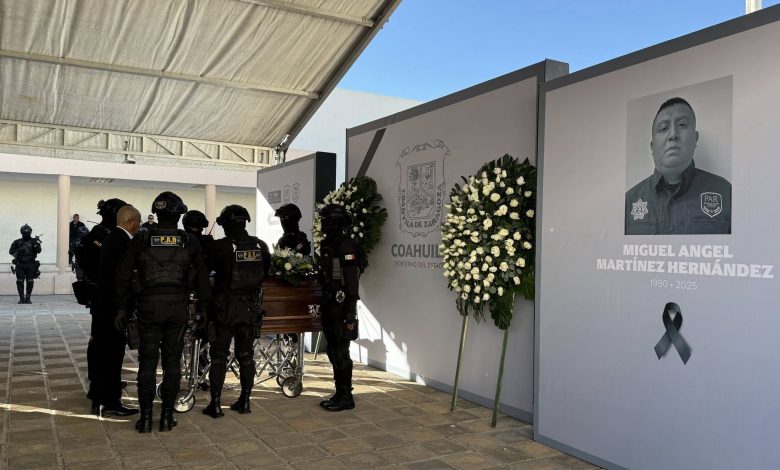 Redacción | Saltillo, Coah.– En una ceremonia solemne realizada en la base de la Policía Estatal, autoridades de los tres niveles de gobierno rindieron homenaje póstumo al comandante Miguel Ángel Martínez Hernández, integrante de la Policía de Acción y Reacción (PAR), quien perdió la vida tras resultar herido en un enfrentamiento armado ocurrido el pasado 18 de octubre en la región norte del estado.
