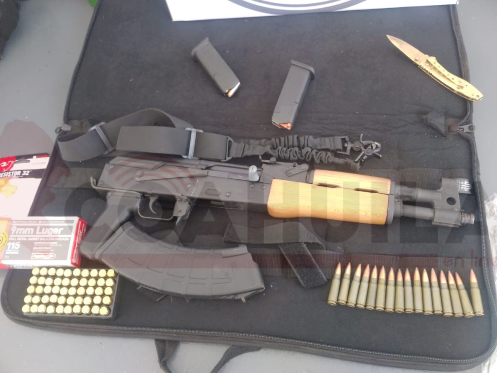 Fue alrededor de las 13:40 horas, cuando las autoridades realizaron una exhaustiva revisión a un vehículo de la marca Chrysler 300 con placas NLK-3059 del estado de Texas, donde se encontró una maleta que en su interior tenía un arma AK-47 de la marca Draco, matricula DF-5600-20R0A, misma que fue decomisada por los elementos.