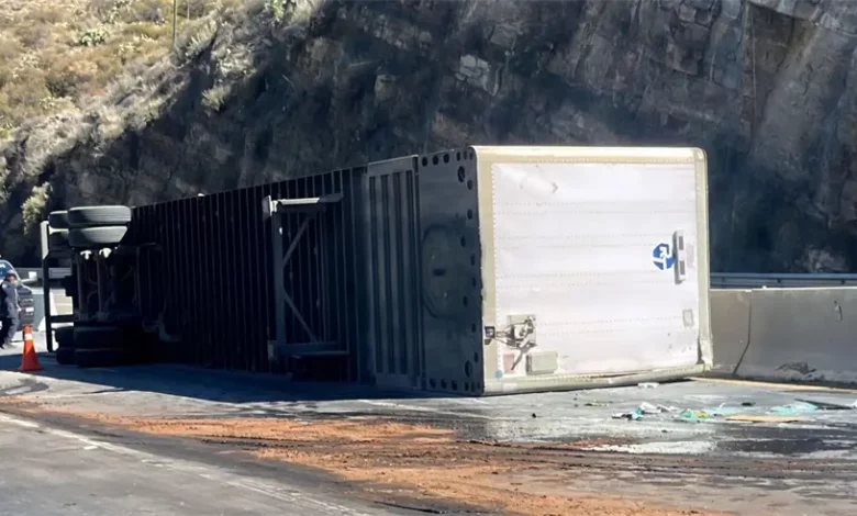 El primero de los percances ocurrió poco después de las 11:00 horas, cuando un tráiler de la empresa Autocarga Peluzqui, que transportaba piezas metálicas, perdió el control presuntamente por exceso de velocidad a la altura del kilómetro 232. La pesada unidad volcó lateralmente y terminó sobre el muro divisor de contención, obstruyendo por completo los carriles con dirección norte-sur.