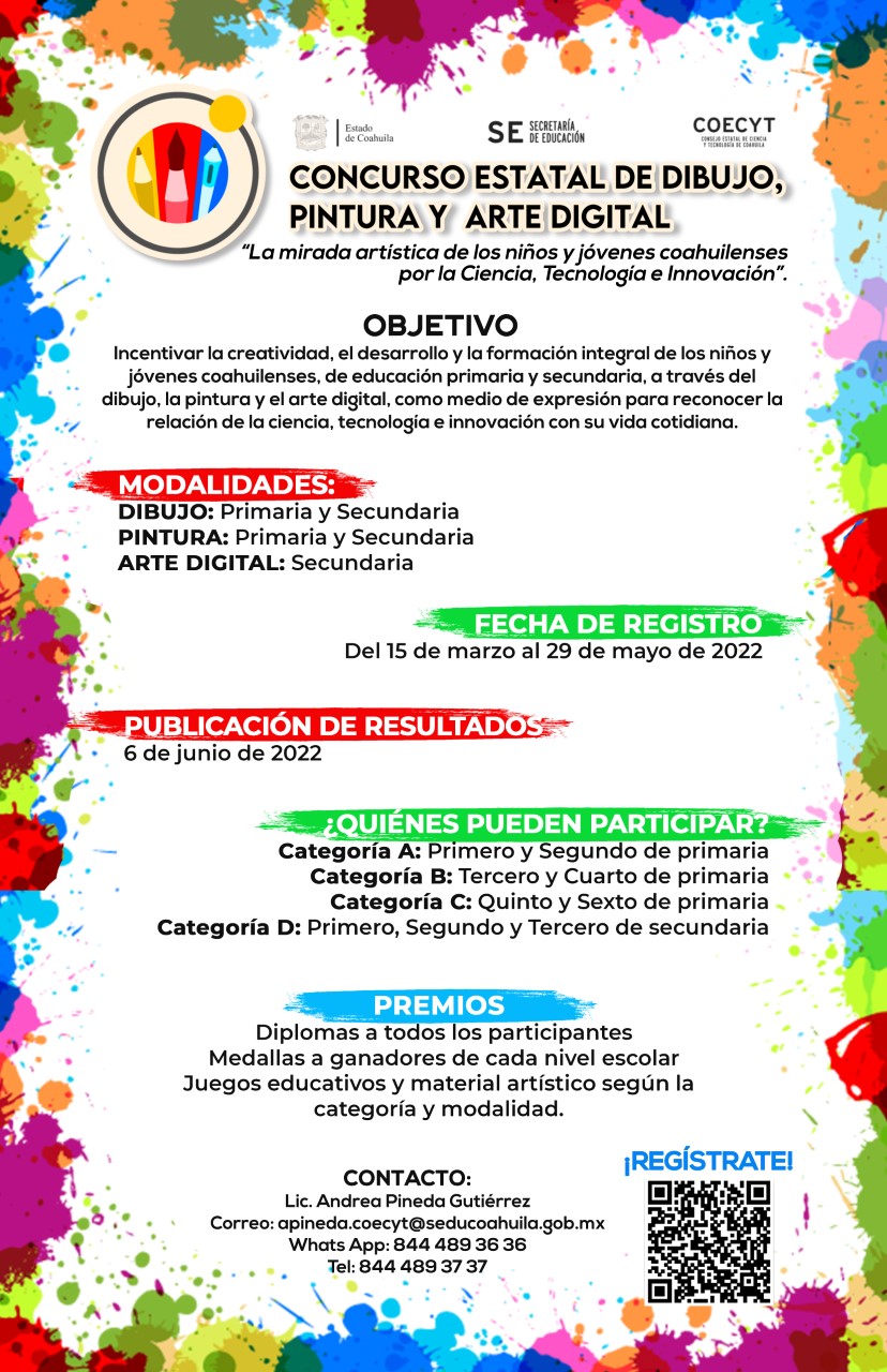 El Estado de Coahuila, a través del Consejo Estatal de Ciencia y Tecnología y en colaboración con la Secretaría de Educación Pública, convocan al 2do Concurso Estatal de Dibujo, Pintura y Arte Digital “La mirada artística de los niños y jóvenes coahuilenses por la Ciencia, Tecnología e Innovación”.
