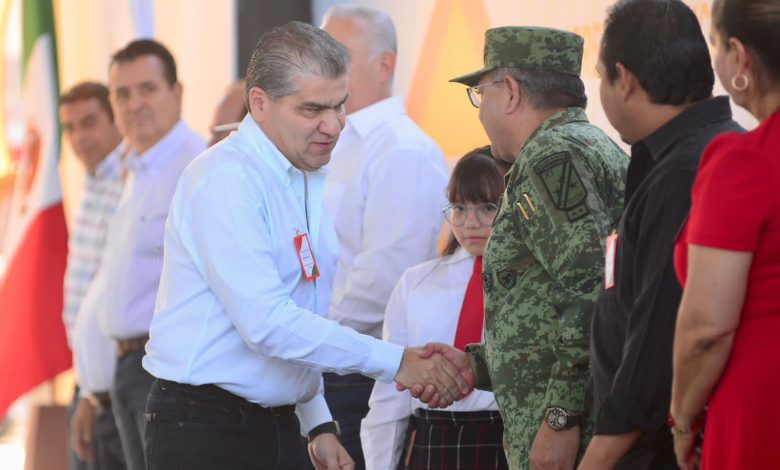 Al encabezar la ceremonia cívica en la Escuela Primaria “Agustín Melgar”, el gobernador Miguel Ángel Riquelme Solís agradeció al Ejército Mexicano (a través del General Eufemio Ibarra Flores, Comandante de la XI Región Militar) por su coordinación con el Estado para que hoy Coahuila esté en paz.