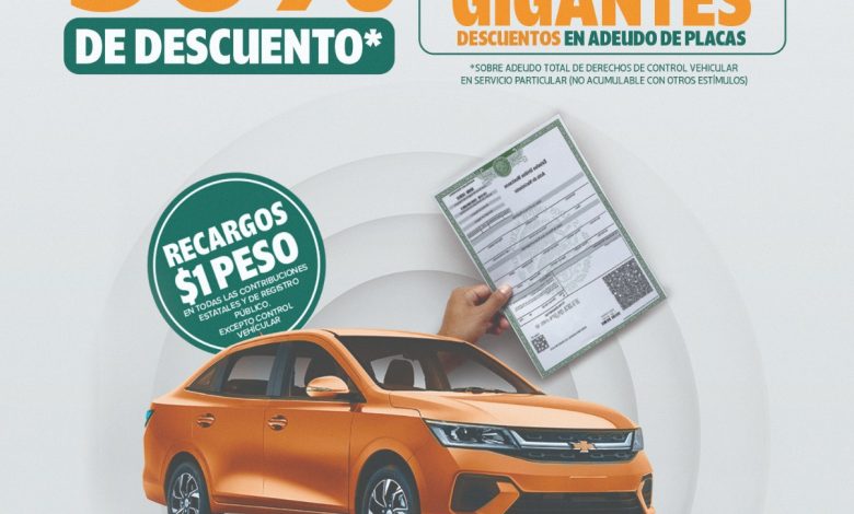 Respecto al control vehicular, los propietarios de vehículos particulares, personas físicas o morales, podrán acceder a descuentos en adeudos de placas o derechos vehiculares.