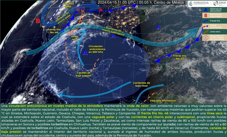 Por otro lado, el frente frío No. 46 se extenderá sobre el norte de México e interactuará con una línea seca, la cual se extenderá sobre el estado de Coahuila. Esto, junto con una vaguada polar y las corrientes en chorro polar y subtropical, propiciará lluvias aisladas con viento del componente sur (surada), con rachas de viento de 60 a 80 km/h y posibles torbellinos en Coahuila.