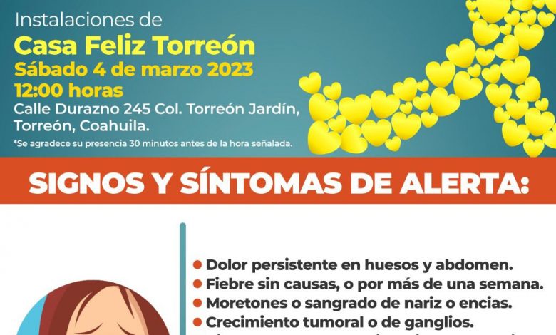 Dentro del marco de conmemoración de la Lucha Internacional Contra el Cáncer Infantil, la Secretaría de Salud de Coahuila, en coordinación con Casa Feliz del Grupo Encendamos una Luz A.C., anunció la Jornada de Detección Oportuna de Cáncer Infantil el próximo sábado 4 de marzo en el Municipio de Torreón.