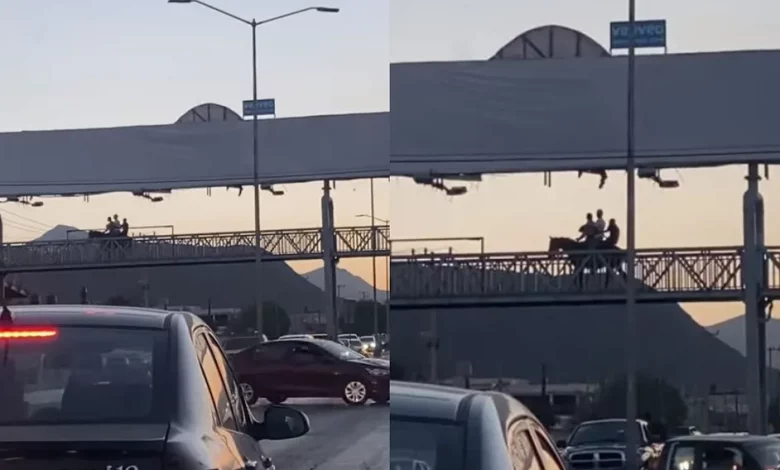 Un grupo de jóvenes fueron captados en Saltillo, Coahuila, cruzando un puente peatonal montando un caballo.