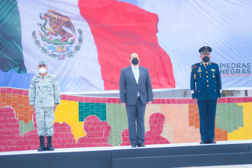 El presidente municipal, Claudio Bres Garza, Coronel de Caballería, D.E.M., Plinio Bonilla Vázquez, comandante del 12 Regimiento de Caballería Motorizada, encabezaron la ceremonia de honor en conmemoración del día de la Bandera Mexicana, en la asta monumental de la Gran Plaza de nuestra ciudad.