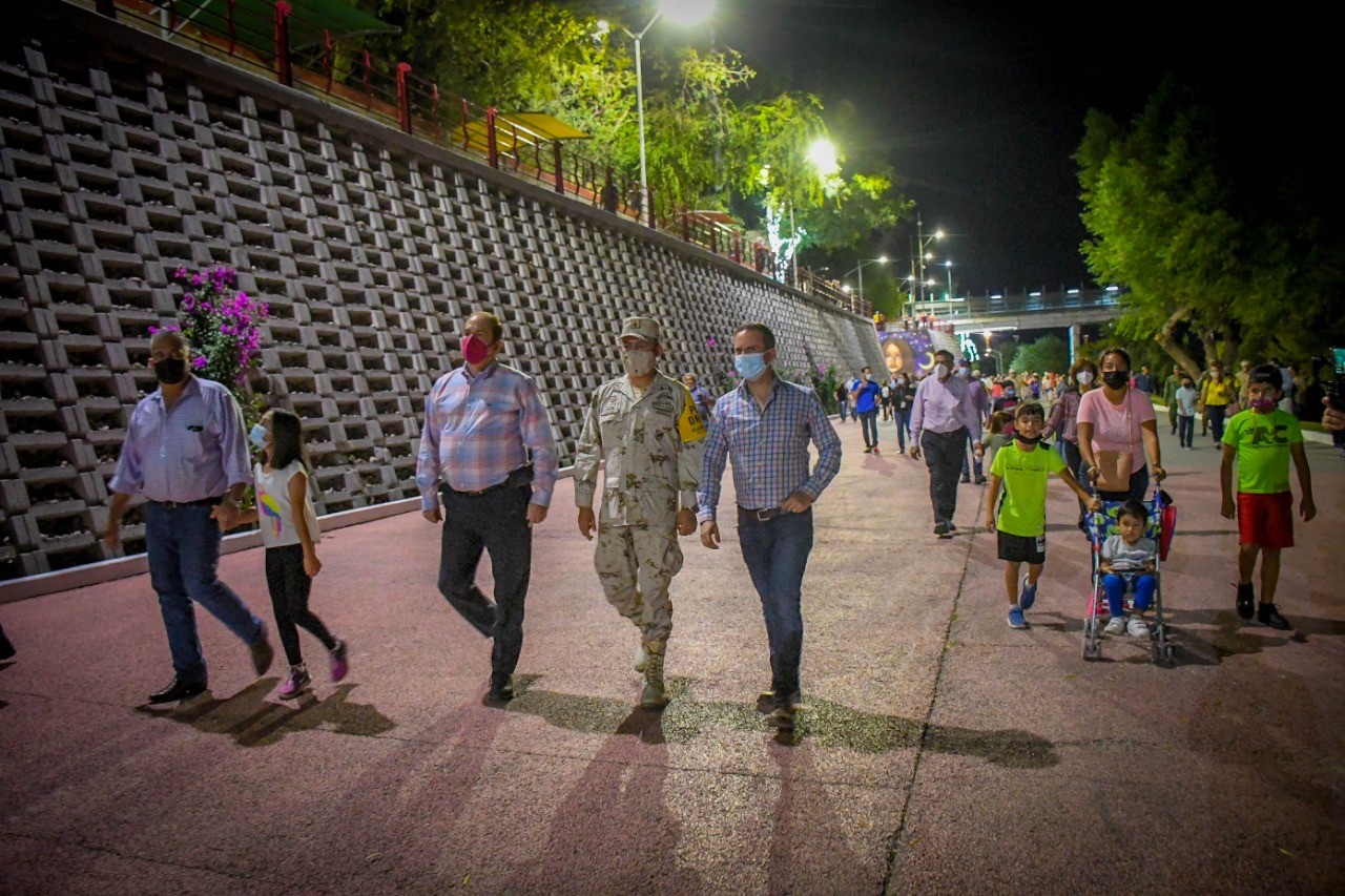 “Hoy estamos aquí, lo estamos viviendo, escogimos este lugar en específico, porque aquí se puede ver y apreciar todo el trabajo que se ha hecho, la obra civil, el trabajo con el tejido social, a través de los murales y pinturas interactivas; de ahí se pasa a la inversión que hizo el mayor cambio para que estemos recorriendo de manera segura, cambiar todo el alumbrado del Paseo del Río a luces tipo LED”, enfatizó Morales de la Tijera.