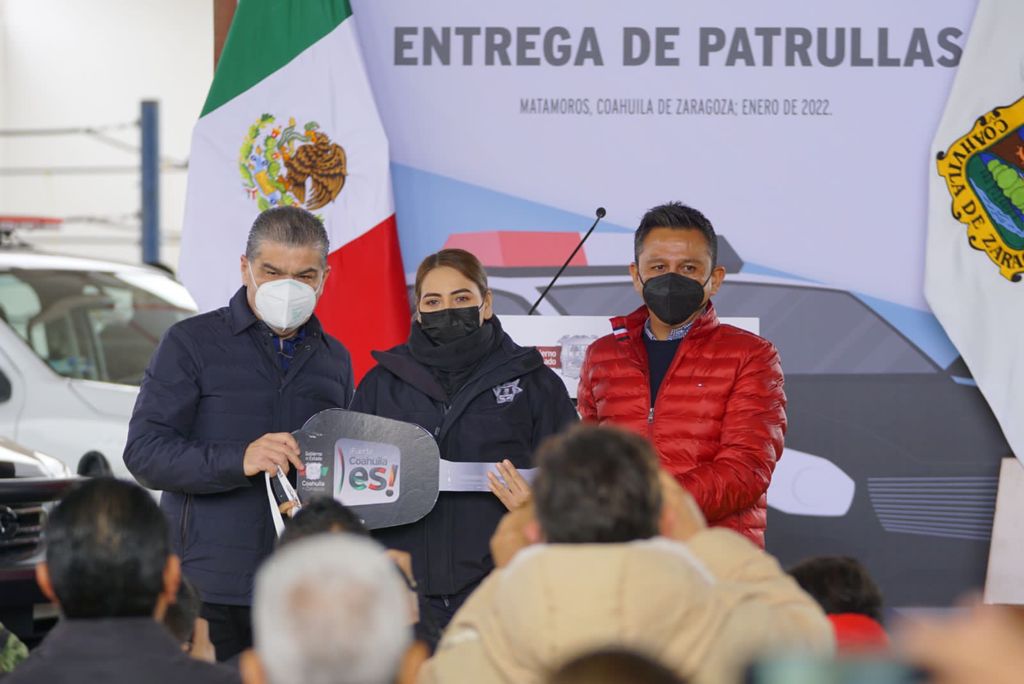 El gobernador Miguel Ángel Riquelme Solís refrendó su compromiso con la seguridad de los coahuilenses al entregar 10 patrullas a la Policía Municipal de Matamoros, además de indumentaria y cámaras, con inversión superior a los 10.5 millones de pesos.
