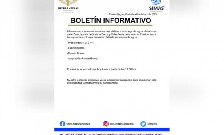 El Sistema Municipal de Agua y Saneamiento de Piedras Negras dio a conocer a través de un boletín informativo sobre la falla del suministro en algunos de los sectores de la ciudad debido a una fuga, durante este lunes.