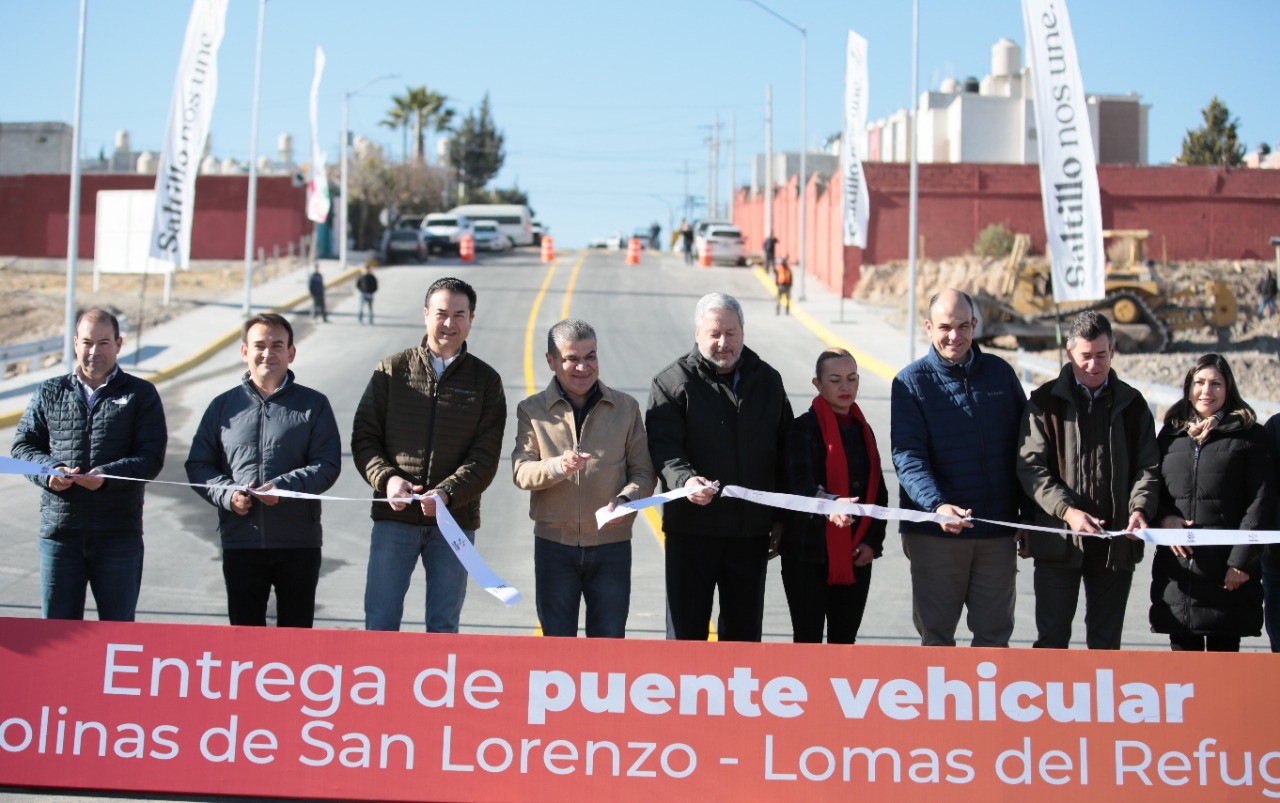 El gobernador Miguel Ángel Riquelme Solís acompañó al alcalde José María Fraustro Siller en la entrega del puente vehicular que une a las colonias Colinas de San Lorenzo y Lomas del Refugio, obra en la que se invirtieron 14.5 millones de pesos.